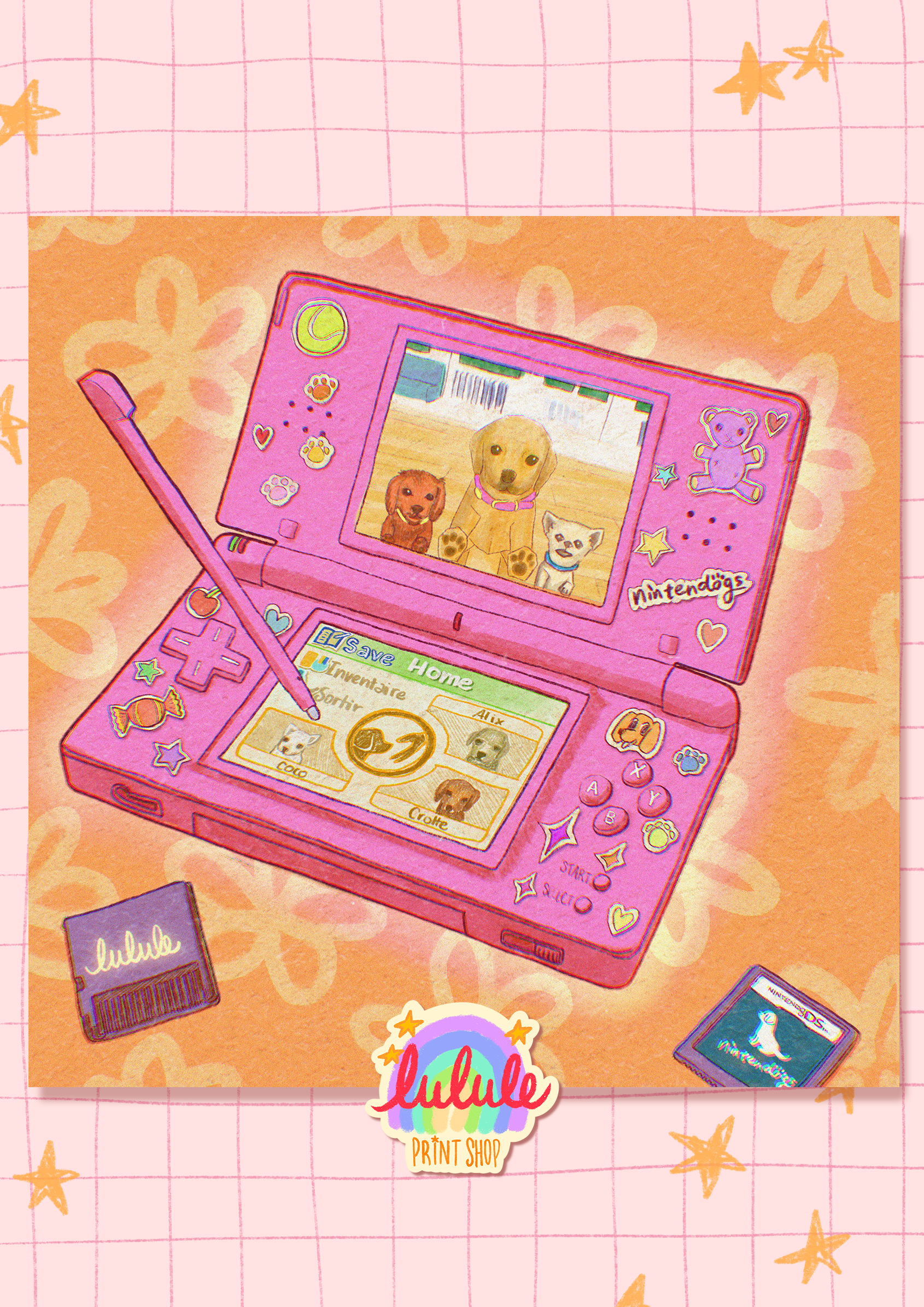 ⭐ "DS: Nintendogs" illustration numérique imprimée ⭐ Format 21x21cm ⭐ Imprimé sur un papier 300g texturé ⭐ Signé à la main au dos 🧡