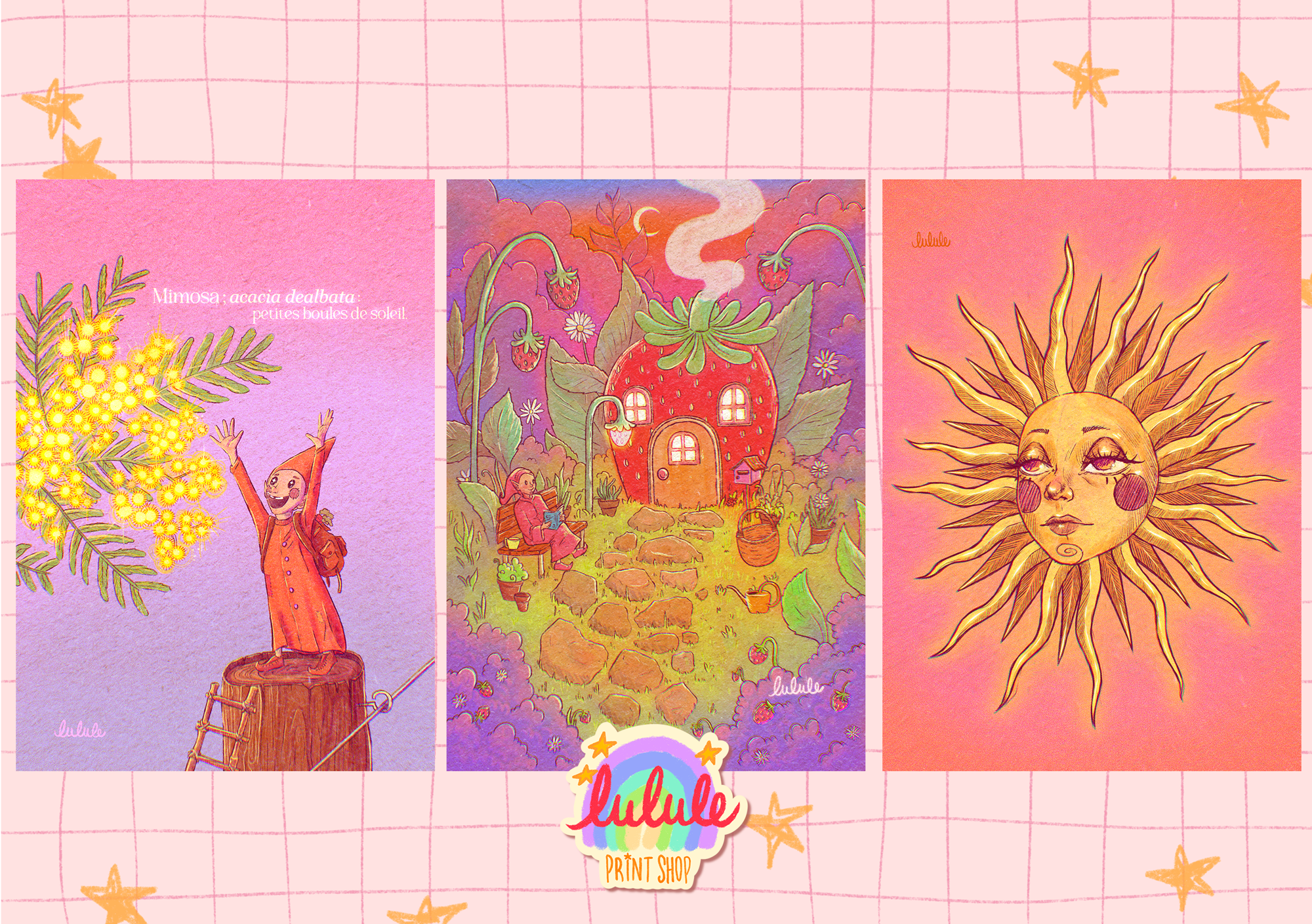 â Lot de 3 illustrations numĂ©riques imprimĂ©es, "Mimosa", "Strawberry Home", "Sun#4"